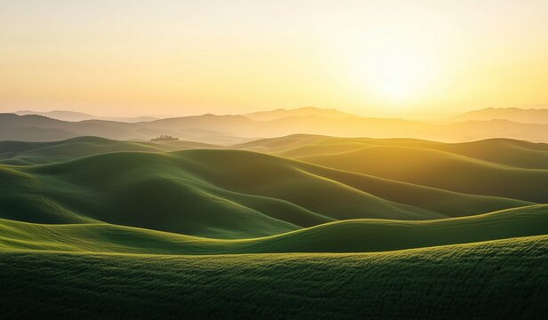 Rolling green hills under soft sunrise creating inviting peaceful landscape bathed in golden light with warm hue across each wave