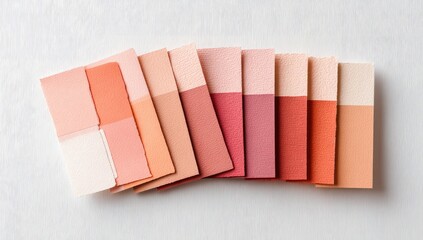 A semi-circle of small, rectangular paper swatches displaying a gradient of peachy-pink and coral hues on a light background