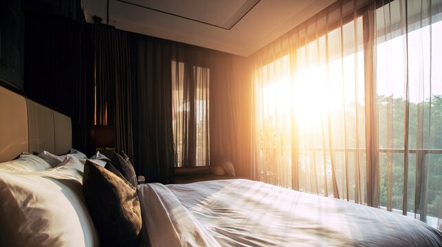 Hotel bed with crisp white linens and decorative pillow in soft morning light through sheer curtains.