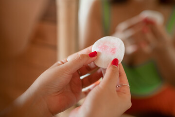 Woman applying cotton pad during morning skincare routine at bathroom mirror for self-care