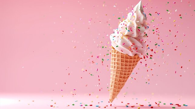 Soft Serve Ice Cream Cone with Sprinkles, Delightful Dessert, Pink Background