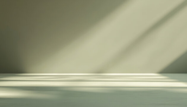 Minimalist abstract light background for product presentation in green tones. Soft shadow from the window on empty wall.