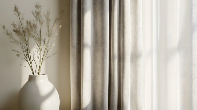 Minimalistic abstract gentle light beige background for product presentation with light and shadow of window curtains on wall : Generative AI