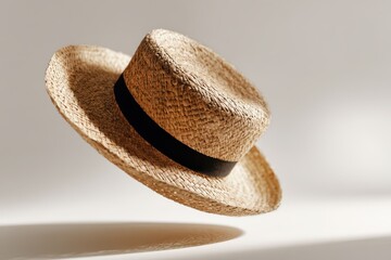 Floating santa hat over candy cane striped platform casting shadow under blue sky
