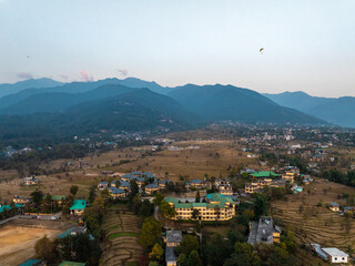 Aerial view of sprawling architecture nestled amidst the rugged, undulating terrain, as the landscape transitions from rich greens to earthy browns under a soft sky, Baijnath, Himachal Pradesh, India.