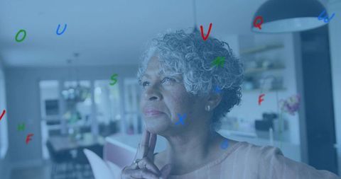 Senior woman contemplating in kitchen with colorful letters overlay, soft bluish portrait