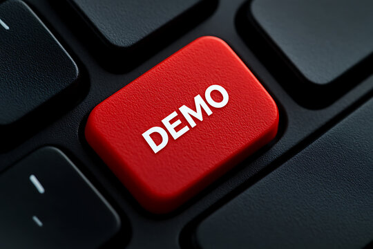 A red 'DEMO' computer key against a black keyboard, suggesting a demonstration or test version of software or equipment. Close-up shot.