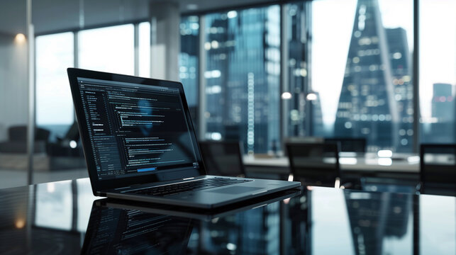 Developer coding on laptop in open-plan office with futuristic data visualization overlays