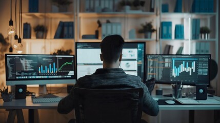 A professional young software developer is sitting at his desk in his home office and working on a big project for his company on a computer. Engineer programming, technology, and coding