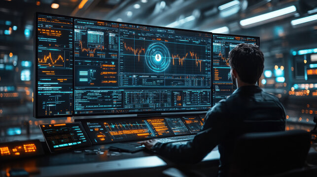 Developer reviewing code on desktop monitor with futuristic hud overlay and hexagonal ui