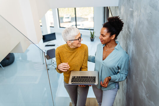 Diverse team of young professionals collaborate on project using laptops. People work together in modern office space, sharing ideas and smiling during meeting. Group engaged in tech discussion.