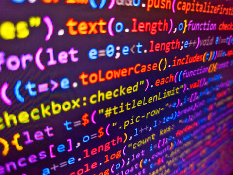Programming code with black background. Screen of code for overlay background. Ticker on monitor screen. Software development. Developer work. Programmer monitor with php language code.