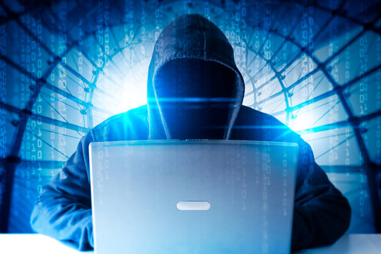The abstract image of the hacker using a laptop overlay with source code hologram image. the concept of cyber attack, virus, malware, illegally and cyber security.