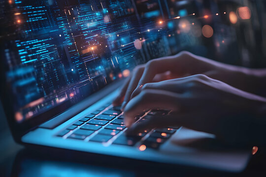 Hands typing on a laptop with glowing digital data streams overlay