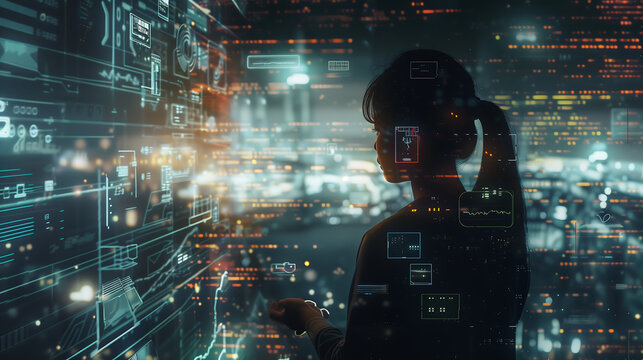 futuristic digital landscape with glowing holographic screens displaying data and code, showcasing the power of AI technology in software development and coding services
