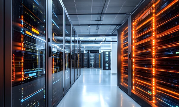 Advanced data center showcasing server cabinets and high tech equipment for cloud computing services