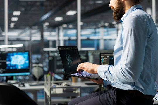 Programmer coding in high tech data center office, updating AI automation scripts. Server room employee programming artificial intelligence algorithms, debugging equipment racks