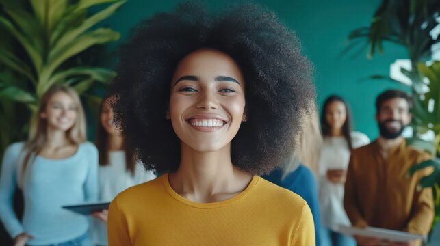 Team of smiling software developers collaborating in a modern office space, showcasing teamwork, technology, and creativity in a dynamic work environment