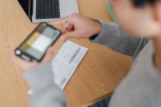 Close-up image of a smartphone in a man's hands, displaying a scanned bill on the screen. It highlights the use of mobile technology for online payment