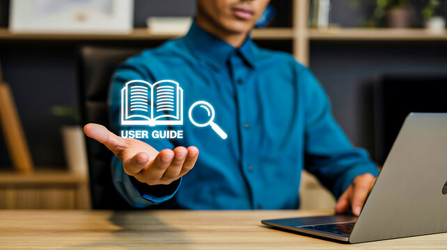 Person holding digital USER GUIDE icon with book and magnifying glass symbolizing instructional support, tech help and software onboarding