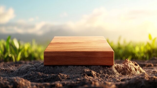 Square wooden block on natural soil with greenery background. Generative AI