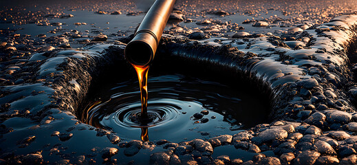 A pipe leaking oil or oil derivatives into a hole in the ground. Concept of soil pollution due to chemical spills.