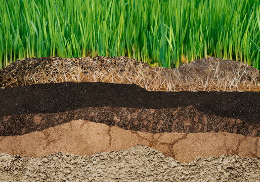 Isometric Soil Layers diagram, Cross section of green grass and underground soil layers beneath, stratum of organic, minerals, sand, clay, Isometric soil layers.