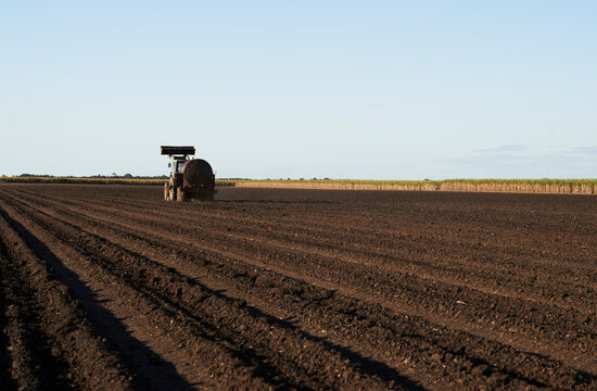 A farmer in a tractor prepares the ground of pre seeding chores.