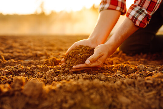 Male farmer's hand holds a handful of dry ground and checks soil fertility and quality before sowing crops on plowed field at sunset. Cultivated land. Concept of organic agriculture and agribusiness.