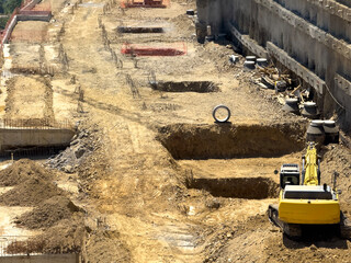 Metallic jaws of a yellow excavator focus on the earth as it digs into the brown soil at a vibrant construction site, where activity fills the air under a clear blue sky