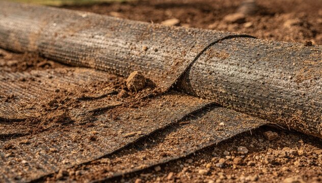Closeup of landscaping rolls laid over uneven terrain with soil layered on top focusing on weed prevention and ground reinforcement.