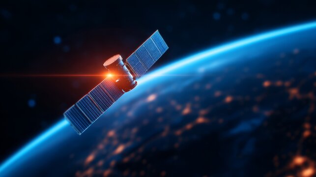 A satellite orbits Earth, showcasing solar panels and a glowing light against a backdrop of the planet and city lights below.