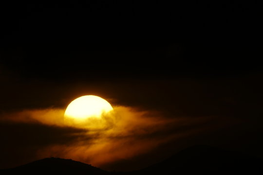 Dramatic winter sunset in monochrome gold with the sun's disk partially hidden behind majestic swirling clouds