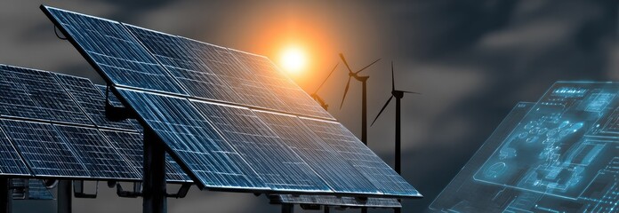 Solar panels and wind turbines under dramatic sky, overlaid with digital interface