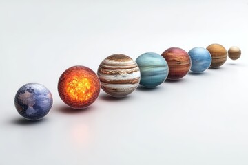 Seven celestial spheres aligned, simulating planets, on a clean, white background