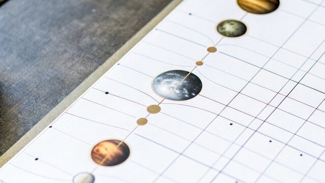 A close-up of a printed solar system chart showing planets aligned with orbital paths and s on a white background with a textured surface beneath.