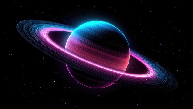 Pink striped planet with purple rings rotating in glowing bokeh space scene, fantasy futuristic