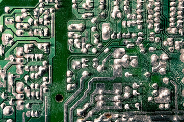 Extreme closeup of a green printed circuit board pcb with intricate pathways, solder points, and electronic components