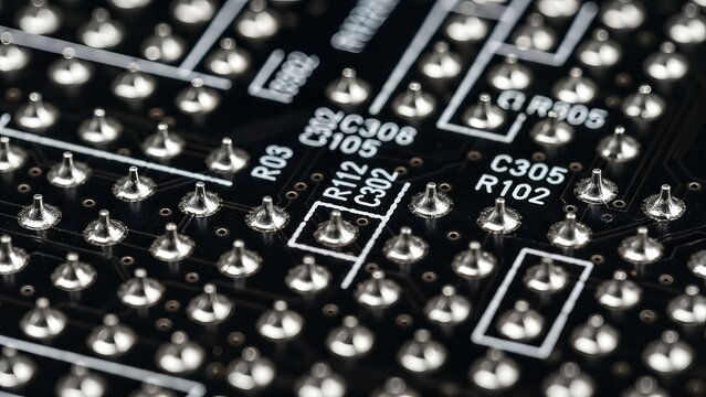 Close up of electronic circuit board with trace patterns and solder points in monochrome