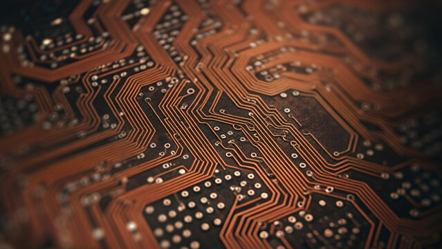 Circuit board close up with copper traces and solder points abstract view, shimmering metallic lines and tiny details that highlight the artistic side of technology.