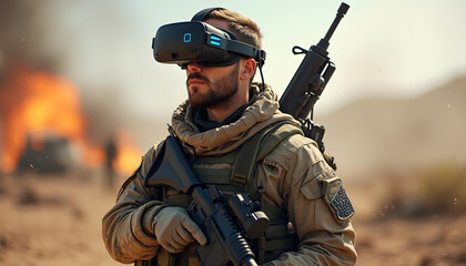 Soldier using advanced virtual reality headset during training exercise in military facility