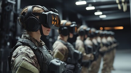 Soldiers in military gear train using virtual reality headsets, blending technology with tactical preparation in a futuristic setting.