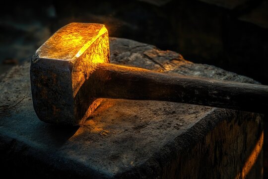 Glowing Metal Hammer on a Blacksmith Anvil