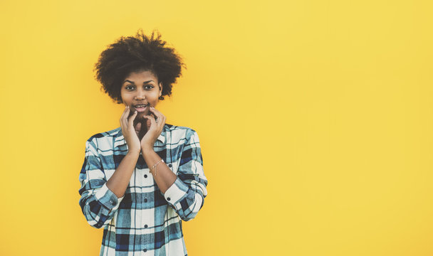 Afro american young female model in checkered shirt is making surprised face, black teenage curly girl in plaid shirt with open-eyed emotion and copy space place for logo, message or your advertising