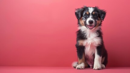 A playful Australian Shepherd puppy sitting on a solid pastel red background with space above for text