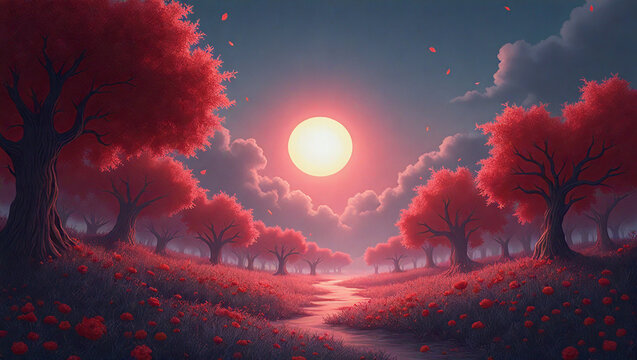 Deep crimson carpet stretches across a room, backdrop of solid red wallpaper, space, scarlet