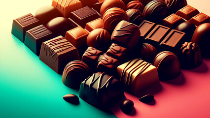 sweet tasty chocolate pieces artistically arranged on a colorful background.