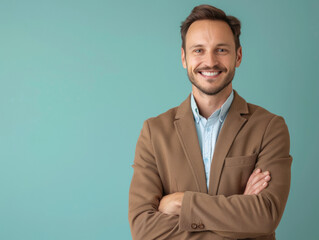 Studio portrait of a cheerful young man wearing a green shirt, smiling against a green background