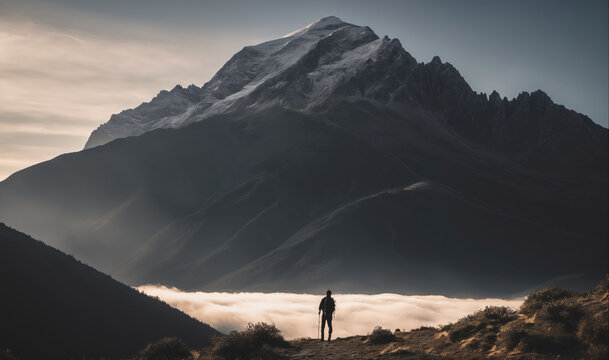 Solo hiker trekking through rugged mountain landscape