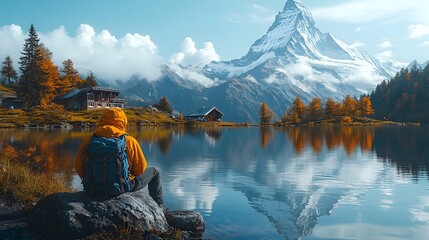 Solitary hiker resting by a serene alpine lake with a majestic mountain reflection